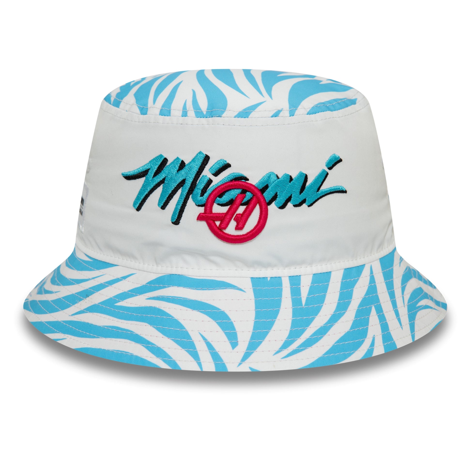 This trendy Bucket hat has a Zebra print design with the Haas F1 logo and a Miami graphic. Perfect to celebrate all things Miami this season. Made by and featuring the New Era Flag.