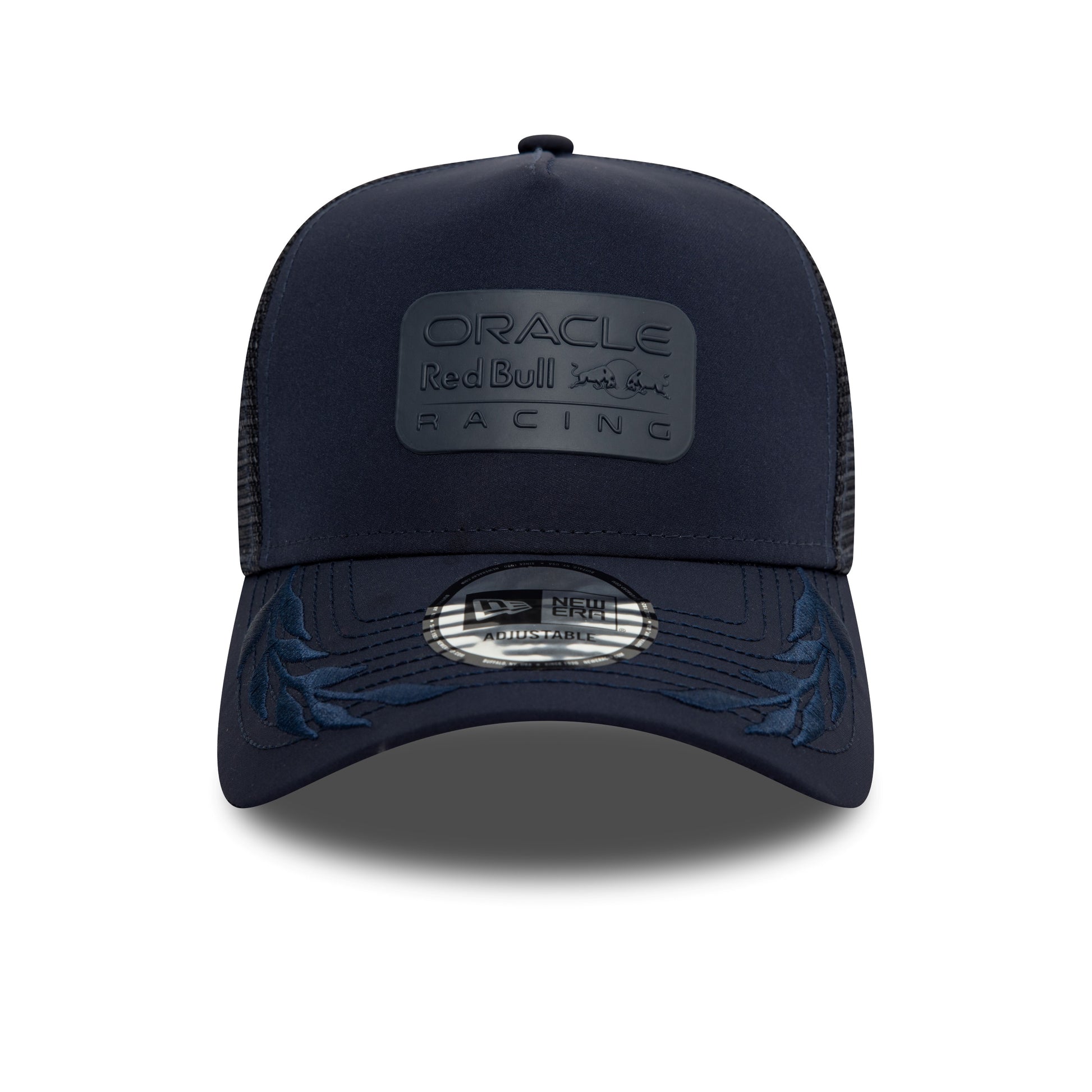 The Oracle Red Bull Racing Tonal 9FORTY E-Frame Trucker Snapback features a Oracle Red Bull Racing raised wordmark block on the front panels, tonal mesh back panels, and tonal floral details on the visor.